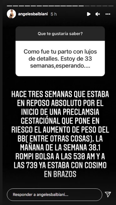 En ese intercambio, un usuario le consultó: “¿Cómo fue el parto y si te costó quedar embarazada?”. Con total honestidad y sin tapujos, Balbiani contó: “Fue cesárea, porque Cosimo estaba sentado y rompí bolsa a las 5:30 de la mañana. Tardé siete meses en quedar de forma natural, pero estaba lista para arrancar un tratamiento”.
