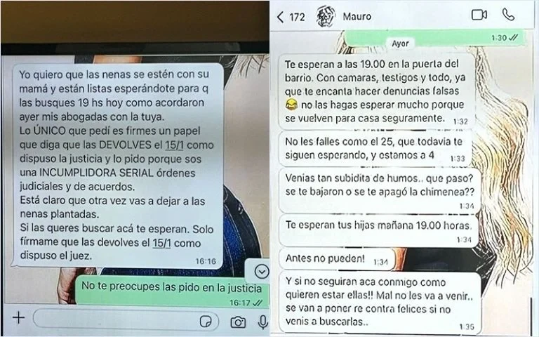 Wanda respondió con firmeza: “Traelas a las 16 o a las 17 para que no sea traumática la vuelta a casa”. Mauro insistió: “Lo traumático va a ser que cuenten los días hasta el 15 que vuelven conmigo”. Además, él pidió que Wanda retirara a las niñas de su casa, mientras ella exigió que él las llevara hasta la suya. “Yo te las llevé, vos me las traés a casa. Hacé las cosas bien”, le dijo.
