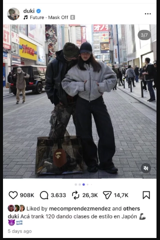 En definitiva, en sus redes sociales, Emilia detuvo la carga de contenidos de su travesía por el lejano oriente, así como Duki también pausó sus publicaciones, aunque se pudo encontrar una foto de ambos, de hace cinco días, en la que se vanaglorian de sus looks en Tokio. "Acá, tranqui dando clases de estilo en Japón", escribió.