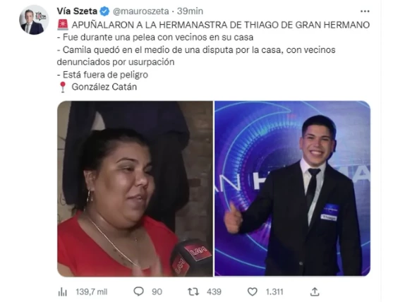 En primera instancia, el comunicador de policiales que trabaja en Telefe compartió el contexto de la trifulca, del altercado y escribió: “Apuñalaron a la hermanastra de Thiago de Gran Hermano. Fue durante una pelea con vecinos en su casa".
