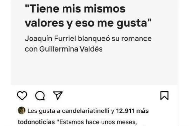 “Tiene mis mismos valores y eso me gusta”, deslizó Joaquín en una nota con La Nación. Debido a que en TN tomaron ese fragmento de la entrevista y lo replicaron en una placa de Instagram, Cande soltó un me gusta que parecía indicar que había buena onda.