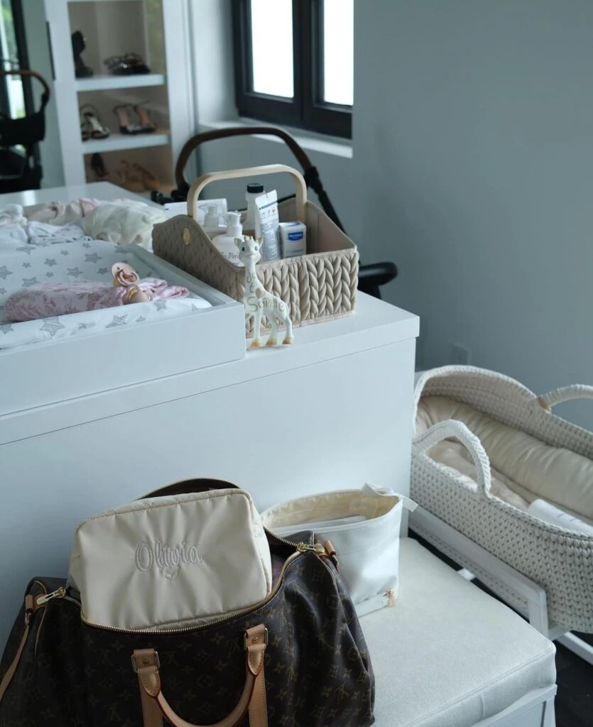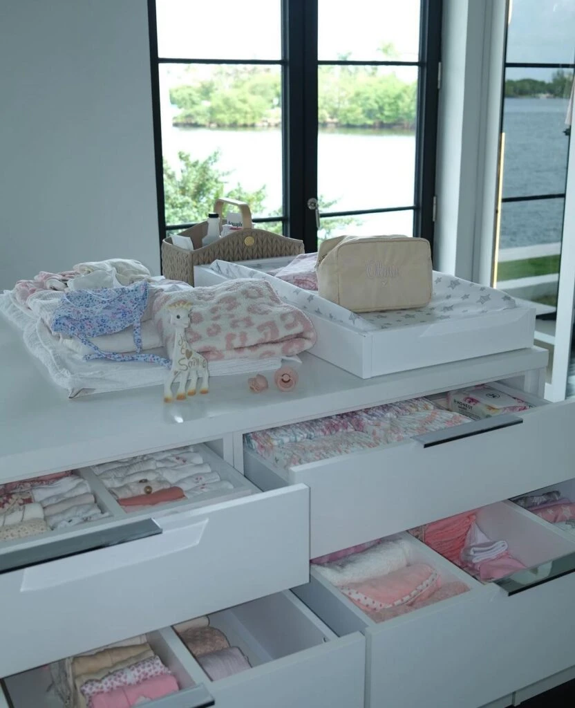 En dicha selección de fotos que la modelo subió a su perfil bien se puede apreciar que tanto en paredes y muebles predomina el blanco, en tanto lo que es ropita de Oli toda en tonos blancos también pero combinado con rosa y perfectamente doblada y guardada en cajones.