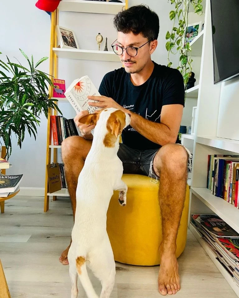 Pasando por la elección de muebles, Guido equipó su living con un cómodo sofá de varios cuerpos: en ese sitio pasa el rato y hasta toma siestas con su perrito y fiel compañero Pepi. Y allí también se instruye, ya que el rack de madera blanca para el televisor también se ocupa como una biblioteca llena de libros y revistas.