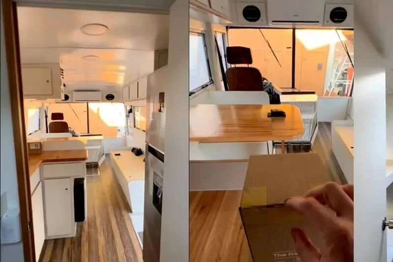 Los tonos claros predominan en toda la estructura, con muebles en blanco y madera clara que aportan luminosidad y una sensación de hogar. Cada rincón fue diseñado para aprovechar al máximo el espacio disponible, sin resignar confort ni estética. Armarios, cajoneras y espacios de guardado se integran de manera inteligente, permitiendo mantener todo ordenado durante los viajes.