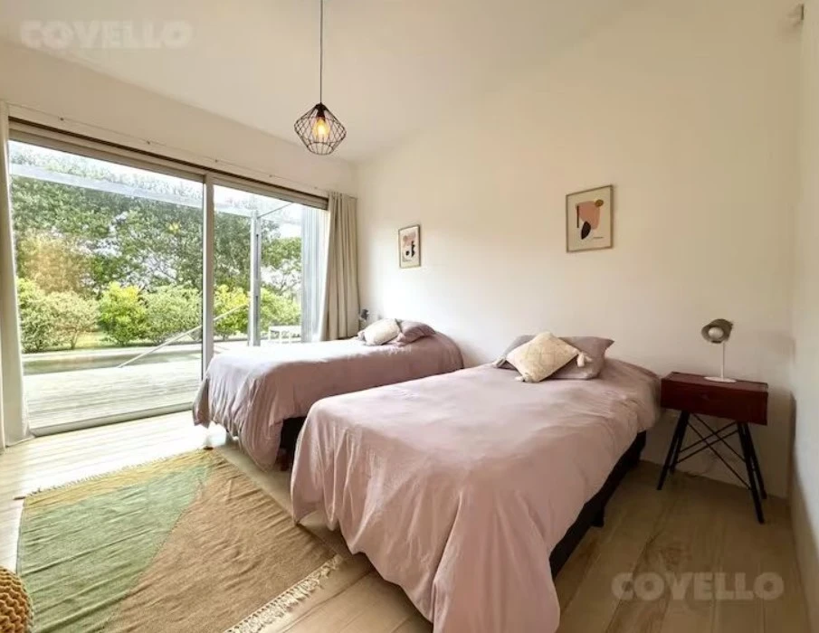 La casa cuenta con 333 m² distribuidos en una planta, sobre un terreno de 1500 m². Incluye 6 ambientes divididos en: tres dormitorios con ventanales grandes y cuadros decorativos, una suite principal de gran tamaño, cuatro baños y un toilette. Además, el lugar cuenta con una piscina espaciosa y una parrilla con las mejores condiciones para disfrutar de la vida al aire libre.