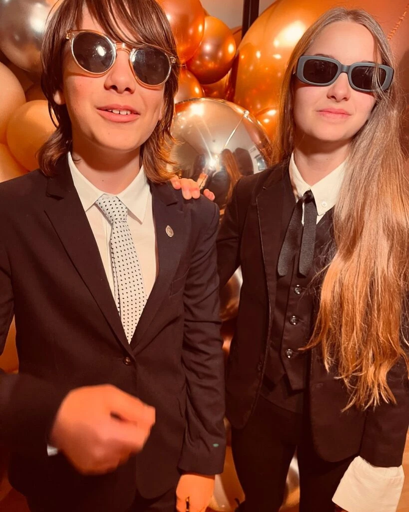 Impecables con sus trajes sastre, los chicos posaron con sus anteojos negros de rigor y se entregaron divertidos a una sesión de fotos con su mamá. Mientras en la mesa había una gran variedad de cosas ricas, como mini empanadas, focaccias, ensaladas, dips, pinchos, langostinos y, a la hora de soplar las velitas, un súper rogel lleno de dulce de leche.