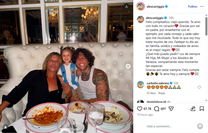 Alex fue quien puso en palabras la emoción del encuentro. “Feliz cumpleaños, viejo querido. Te amo con todo mi corazón", escribió al compartir las imágenes. Y siguió con un mensaje lleno de reconocimiento: “Gracias por ser mi padre, por enseñarme con el ejemplo, por cada consejo y cada valor que me inculcaste. Todo lo que soy hoy tiene mucho de vos".