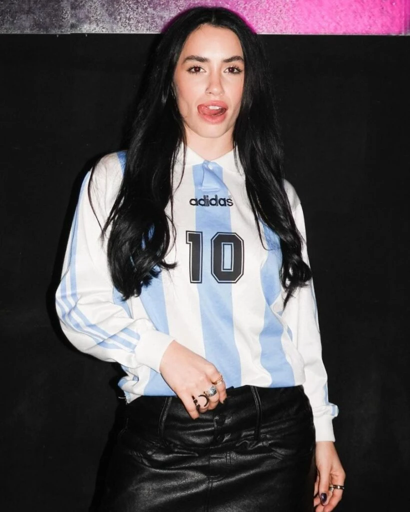 Lejos de llevar un outfit lujoso o que sea tendencia de la temporada o época, la cantante festejó sus 33 años de vida poniéndose la camiseta de la Selección Argentina manga larga que supo utilizar Maradona en su momento de gloria. “Estoy en la cresta de la ola y no da vértigo. Antes buscaba el hit, ahora hago clásicos…”, escribió en un posteo en alusión al look que escogió.