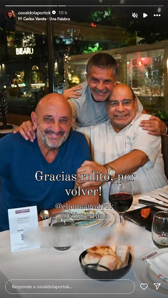 En las redes sociales, Laport celebró el encuentro publicando una foto junto a Serrano y Goity. “Gracias Rolito por volver”, escribió junto a la imagen donde los tres aparecen abrazados y sonriendo. Esta cena marcó el regreso de Serrano a la vida social después de tantos meses en tratamiento.