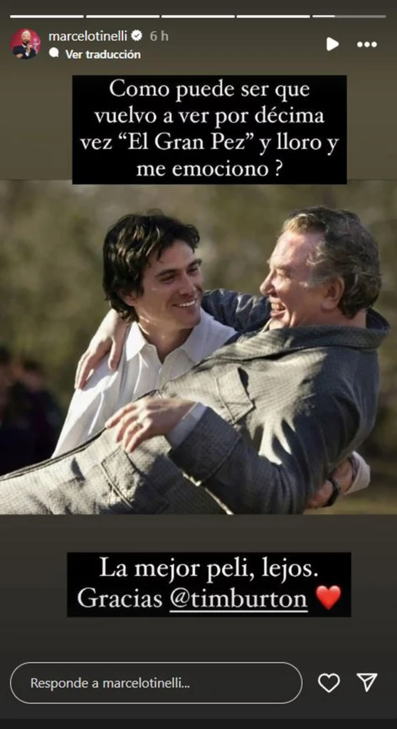 Sin mostrarse sorprendido por lo que ocasionó Tini en su vida, dado a que su hija Cande Tinelli también salió defenderlo pese a que tenían una relación cercana, Tinelli decidió ver una película que lo emociona mucho. “¿Cómo puede ser que vuelvo a ver por décima vez El gran pez y lloro y me emociono? La mejor peli, lejos”, detalló el Cabezón, que horas atrás había compartido un fragmento inédito de VideoMatch.