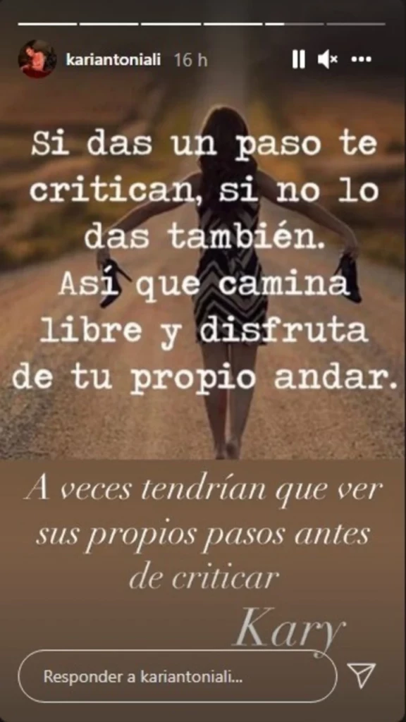 Ahora, la ex mujer de Eduardo, Karina Antoniali, lanzó una fuerte crítica hacia Rocío a través de las redes sociales. La mamá de Macarena, Prieto y Angelina publicó en sus Stories: "Así que camina libre y disfruta de tu propio andar".