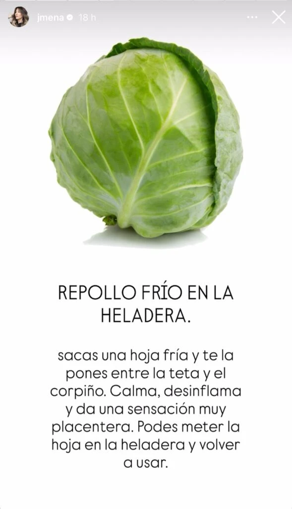 Asimismo, la intérprete de La Cobra hizo un posteo en el que, debajo de la foto de una verdura en particular, tipeó: “Repollo frío en la heladera. Sacás una hoja fría y te la ponés entre la teta y el corpiño. Calma, desinflama y da una sensación muy placentera”.