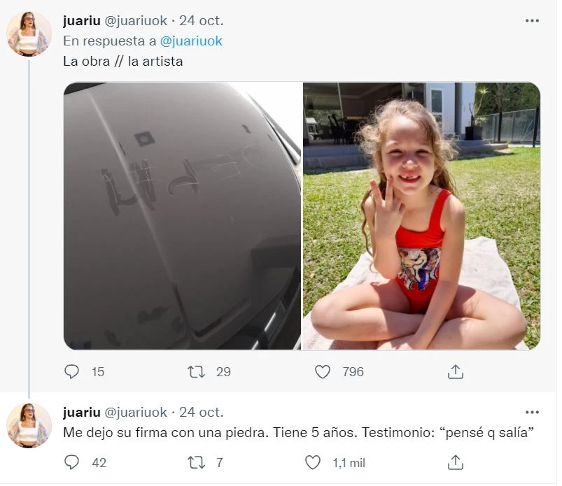Acto seguido, Juariu mostró dos fotos: una del flamante vehículo, donde se ve el nombre “Delfina” marcado sobre el capot. Y otra de la nena. “La obra/ la artista. Me dejó su firma con una piedra. Tiene 5 años. Testimonio: “Pensé que salía”. ¡Qué dolor!