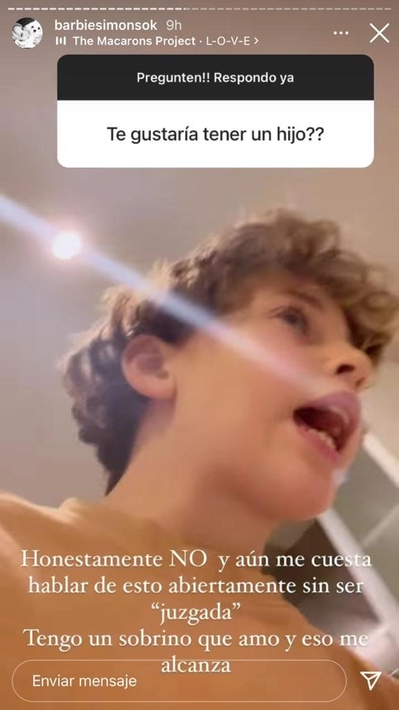 "¿Te gustaría tener un hijo?", disparó un usuario. Directa y sincera, la hija de Leonardo Simons aclaró que no lo desea y, con una foto de su sobrino Oliver de fondo, agregó lo que le pasa con lo que genera en los demás su rechazo a ser mamá.