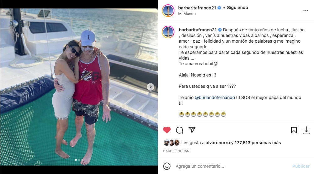 "Te esperamos para darte cada segundo de nuestras nuestras vidas. Te amamos, bebit@. Aún no sé qué es", contó Barby. Luego, le dedicó una lindas palabras al futuro papá. "Te amo Fernando, sos el mejor papá del mundo", expresó con la ternura que la caracteriza.