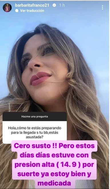 Radiante, con la luz propia de un sueño que se transmuta en realidad. Barby Franco viaja por un campo de emociones maravillosas, que se le activan por esta increíble posibilidad de estar embarazada y en su octavo mes explicó un pequeño problema de salud que la aquejó en estos días.
