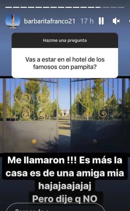 Así se lo dijo a sus seguidores de Instagram, cuando le preguntaron sobre el tema. Desde sus vacaciones en Punta del Este y tras festejar sus once años de amor con Burlando, Barby dijo: "¡Me llamaron! Es más, la casa es de una amiga mía, pero dije que NO".