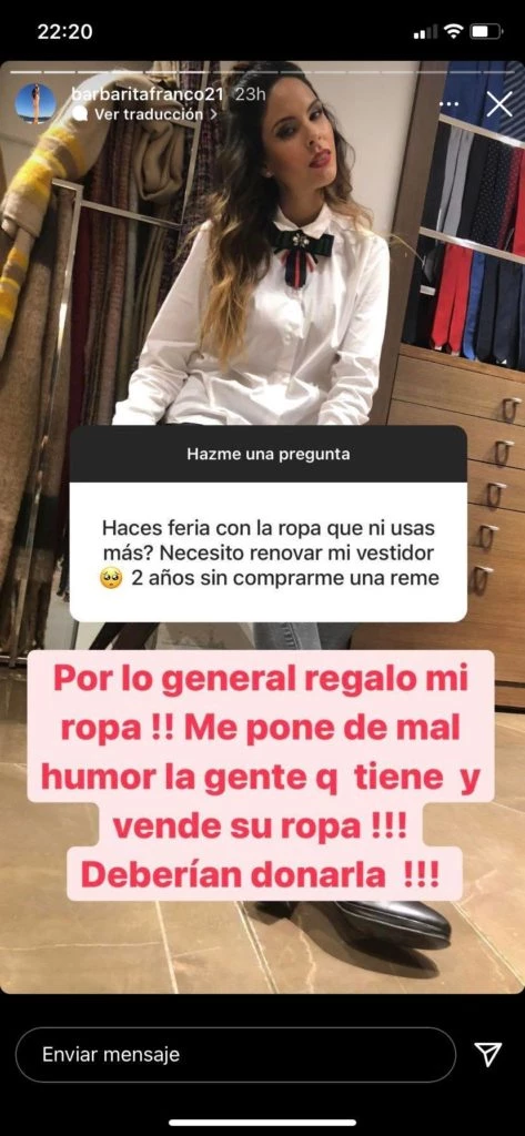"Me pone de mal humor la gente que tiene y vende su ropa. ¡Deberían donarla!", disparó la mujer de Burlando.