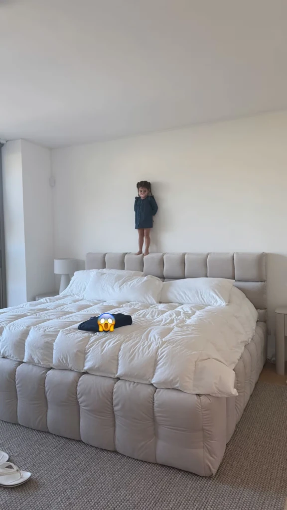 Sarah estaba parada en el respaldo de la cama matrimonial, apoyada contra la pared. Barby filmó ese momento y lo mostró en las stories de sus redes sociales y se la escucha algo aliviada y entre risas que le dice a su hija: “¿Te podés bajar de ahí, por favor?”.