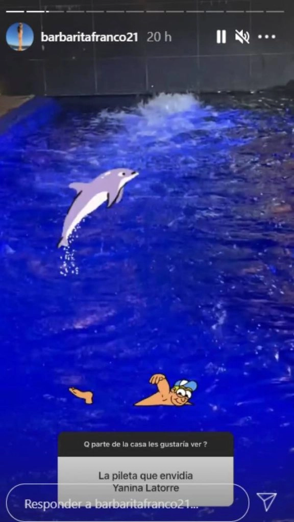 “¿La pileta que envidia Yanina Latorre?”, le pidieron que comparta. A lo que Barby accedió con una postal de la piscina de noche. La misma se encuentra saliendo del living, en la parte de atrás. Un lugar que Burlando diseño y que cuenta con un sistema llamado nado contracorriente, generando el efecto de las olas.