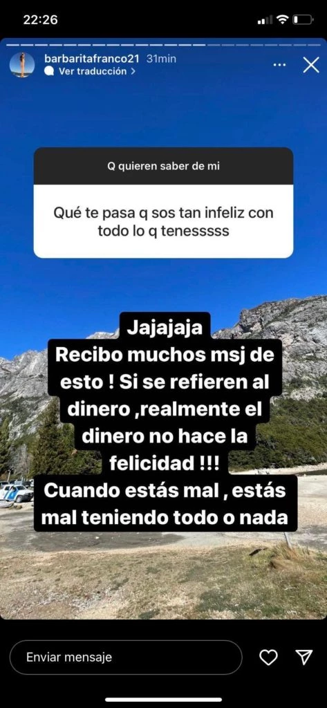 A lo que Franco, utilizando una foto de un paisaje montañoso de fondo y a fin de ilustrar su respuesta, redactó: “Jajaja, recibo muchos mensajes de estos. Si se refieren al dinero, realmente el dinero no hace a la felicidad. Cuando estás mal, lo estás teniendo todo o nada”.
