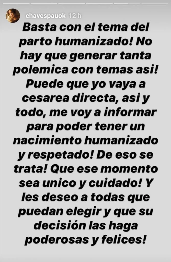 “Basta con el tema del parto humanizado! No hay que generar tanta polémica con temas así! Puede que yo vaya a cesárea directa, así y todo, me voy a informar para poder tener un nacimiento humanizado y respetado. De eso se trata, que ese momento sea único y cuidado. Y les deseo a todas que puedan elegir y que su decisión las haga poderosas y felices”, así compartió su pensamiento la conductora.