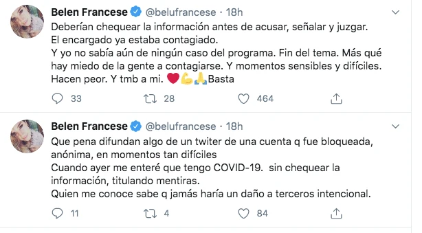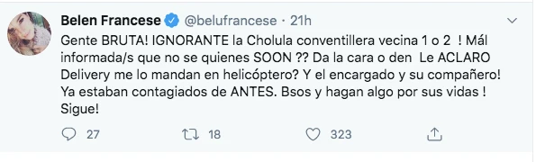 Según ellos, anduvo sin barbijo ni protección por los pasillos y el ascensor del edificio. Belén se defendió y negó las acusaciones. El conflicto no termino allí, sino que se agravó hoy cuando la administración del consorcio, a pedido de los propietarios, emitió una carta de fuerte contenido "anti Francese".