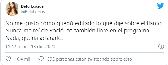 "No me gustó cómo quedó editado lo que dije sobre el llanto. Nunca me reí de Roció. Yo también lloré en el programa. Nada, quería aclararlo", escribió furiosa en Twitter.