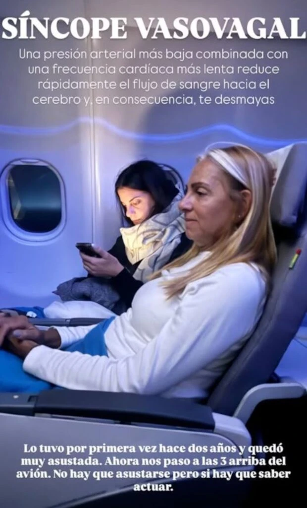 Luego, la influencer explicó en qué consiste esta afección: “Una presión arterial más baja, combinada con una frecuencia cardíaca más lenta reduce rápidamente el flujo de sangre hacia el cerebro y, en consecuencia, te desmayas. Lo tuvo por primera vez hace dos años y quedó muy asustada. Ahora nos pasó a las 3 arriba del avión. No hay que asustarse, pero sí hay que saber actuar”.