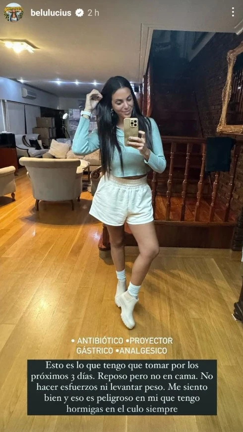 Luego de pasar por el cuchillo y ya en su casa, Belu contó a su comunidad de IG cómo supera estos primeros días molestos con la ayuda de su marido y de su hermana Emily. Si bien se siente bien, Lucius señaló los incordios que atraviesa con la panza hinchada mientras toma antibióticos, protector gástrico y analgésicos.