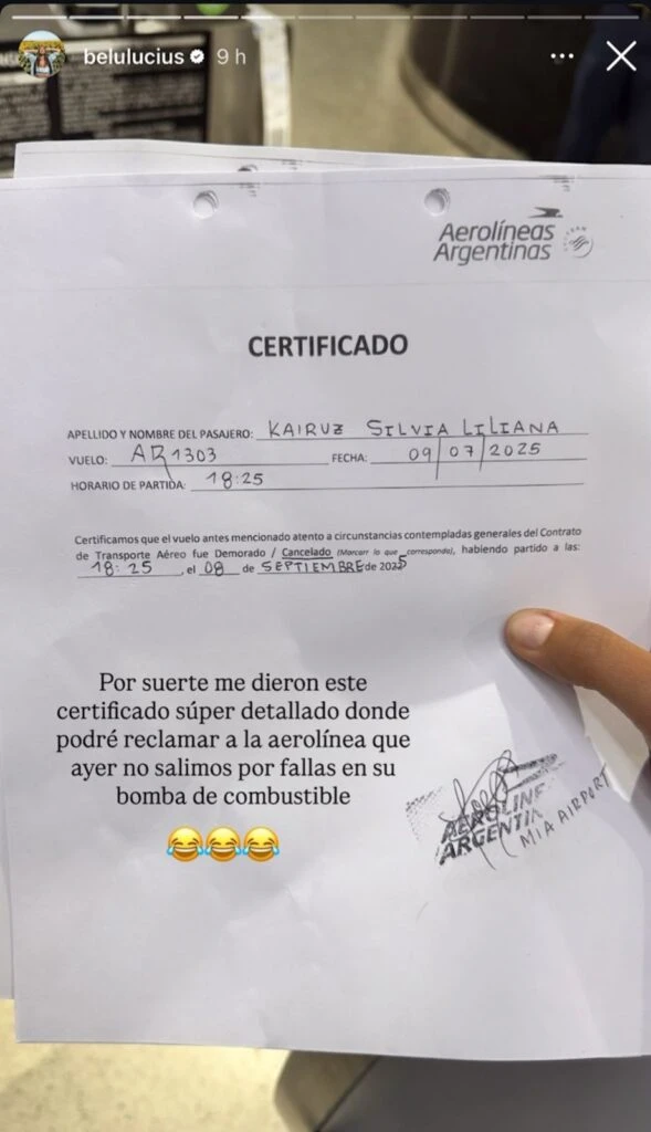 Tras haber sido cancelado su vuelo por una falla en la bomba de combustible, y antes de poder retomar la vuelta, Belu siguió: “Hoy salía un vuelo a la mañana que me hubiese dado la oportunidad de estar en el evento del Garrahan, cosa que no voy a poder estar porque no tuve lugar en el vuelo de la mañana por la avivada de argentinos pillos. Por ser educada me cagaron”.