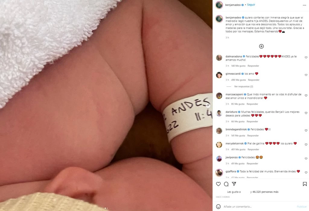 Dalma Maradona, quien mantiene una gran amistad con el artista, se mostró súper feliz con el nacimiento de la bebita y comentó: "Felicidades. Andes ya te amamos mucho". Por su parte, Gime Accardi, quien trabajó con él en Casi Ángeles, expresó: "Los amo".