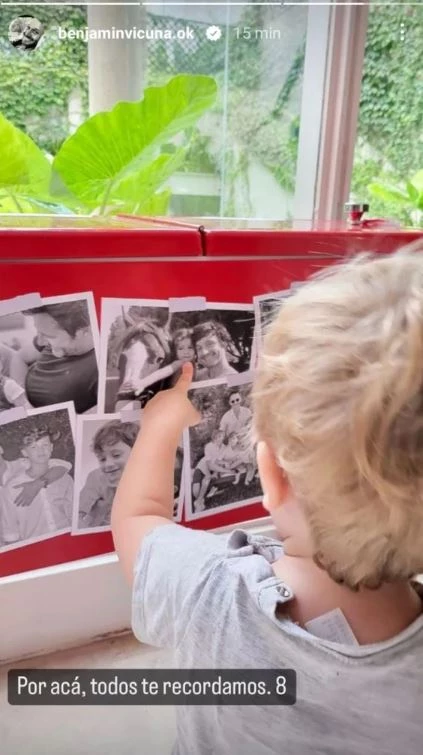 Y el 8 de agosto, el actor chileno eligió una manera muy dulce de homenajear a su primogénita: fotografió a Amancio, su hijo menor, de dos años, señalando con su dedito una foto de Blanca en un panel repleto de imágenes en blanco y negro que retratan distintas escenas de Benjamín y sus hijos.