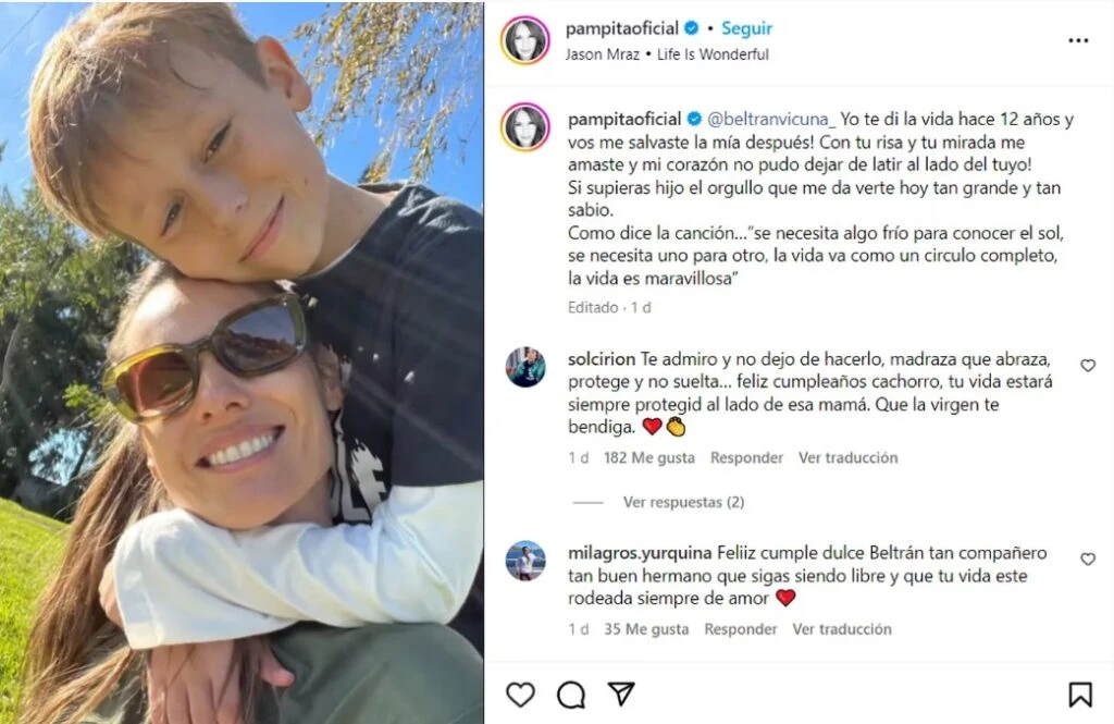 “¡Yo te di la vida hace 12 años y vos me salvaste la mía después! ¡Con tu risa y tu mirada me amaste y mi corazón no pudo dejar de latir al lado del tuyo!”, comenzó Pampita, en el escrito que le dedicó a uno de sus 5 hijos, en redes sociales.