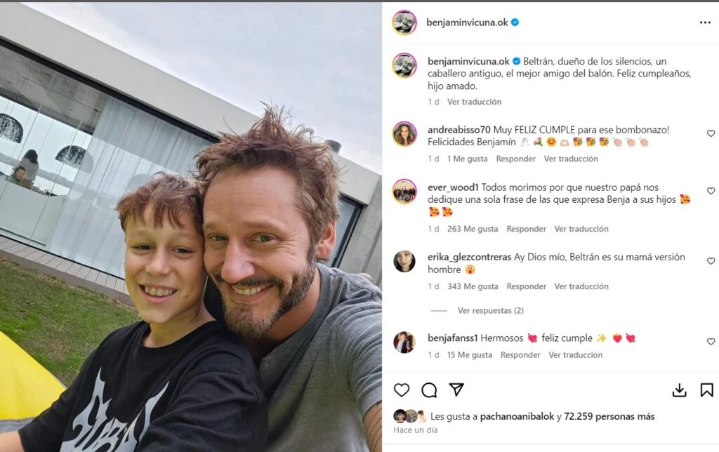Por su parte, el papá del adolescente, Benjamín Vicuña, también hizo una amorosa publicación en sus redes sociales, donde volcó todo su amor hasta el varón más chico de los hijos que tuvo con la conductora. "Beltrán, dueño de los silencios, un caballero antiguo, el mejor del balón. Feliz cumpleaños hijo amado".