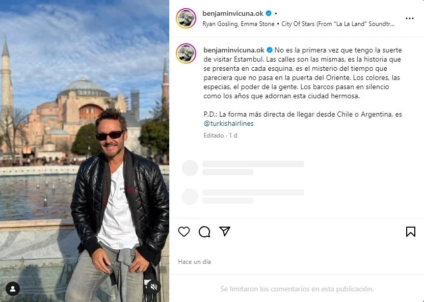 “No es la primera vez que tengo la suerte de visitar Estambul. Las calles son las mismas, es la historia que se presenta en cada esquina, es el misterio del tiempo que pareciera que no pasa en la puerta del Oriente. Los colores, las especias, el poder de la gente. Los barcos pasan en silencio como los años que adornan esta ciudad hermosa”, escribió Vicuña junto a una serie de bellas imágenes de la ciudad turca.