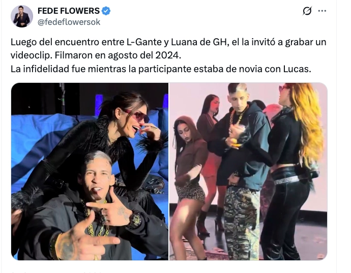 “Luego del encuentro entre L-Gante y Luana de GH, el la invitó a grabar un videoclip. Filmaron en agosto del 2024. La infidelidad fue mientras la participante estaba de novia con Lucas”, destacó el comunicador de El Observador.