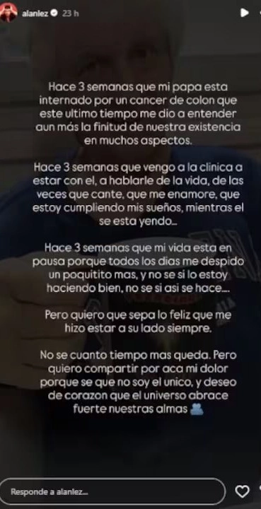 “Mi papá está internado por un cáncer de colon que en este último tiempo me dio a entender aún más la finitud de nuestra existencia en muchos aspectos”, comenzó diciendo Alan, generando un fuerte impacto en sus seguidores.