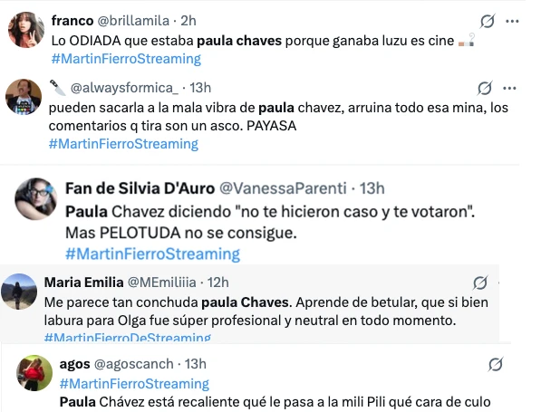 Los mensajes anti Paula Chaves se sucedieron sin freno. "A pesar del robo del siglo a AQN y a Nicolas en el oro, disfruté cada vez que Paula Chaves tenía que decir que el ganador era luzu con la cara odiada qué no podía disimular, y si reina, son los reyes" fue uno. "Chicos LO MALA LECHE que fue Paula Chaves en toda la conducción tirando mierd4 a cada rato" fue otro.