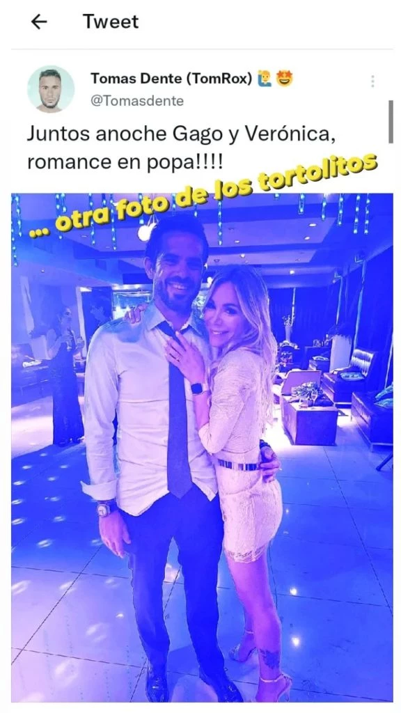 Los tortolitos se mostraron juntos y aparecieron fotos grupales pero también de la pareja abrazados y con su romance viento en popa. Fue Tomás Dente quien compartió en Twitter una de las postales_ "Juntos anoche Gago y Verónica, romance en popa".