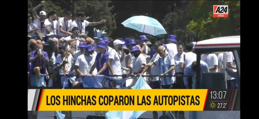 El micro fue un verdadero carnaval. Los jugadores hasta tiraban espuma a la gente, que deliraba como nunca a los costados del vehículo plotado para la ocasión: se veían las tres estrellas que tenemos ahora, la frase "coronados de gloria" en la parte delantera y la inscripción "campeones del mundo" en la luneta trasera. Había banderas, gorros, bombos, música, baile, saltos, gritos. Lionel Scaloni lloraba y decía una y tra vez "vamos argentina, vamos argentina". Era un hincha más, como Paulo Dybala, que se puso un gorrito de Instituto de Córdoba, el club que lo vio nacer y que acaba de volver a primera división.