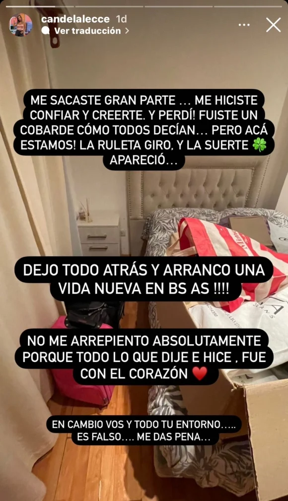 “Me sacaste gran parte, me hiciste confiar y creerte. Y perdí. Fuiste un cobarde como todos decían… pero acá estamos. La ruleta giró y la suerte apareció”, escribió la joven. Detrás del texto se puede observar una maleta con ropa a modo de mudanza y dejando entrever que comenzaría una nueva vida en Buenos Aires tras el escándalo.