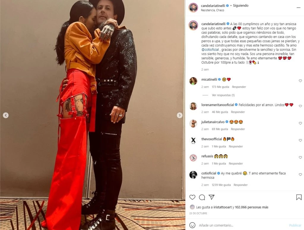 El pasado 23 de octubre, Candelaria Tinelli y Coti Sorokin celebraron su primer año de novios. La influencer le dedicó un romántico posteo en su cuenta de Instagram y celebró tener al cantante en su vida.