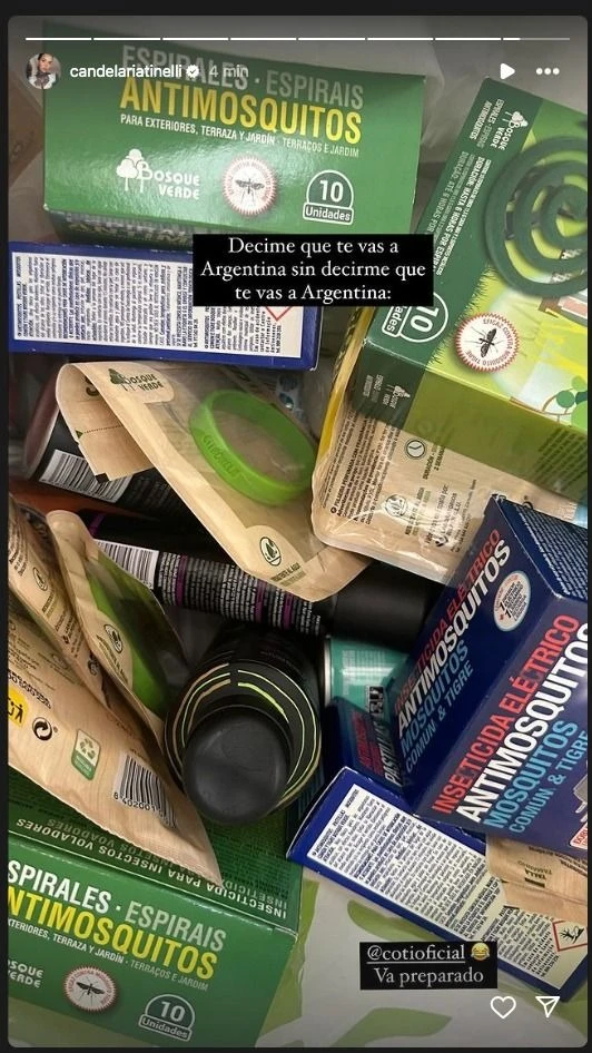A través de las redes sociales, precisamente de Instagram, la cantante compartió con sus seguidores los repelentes, espirales y demás productos para cuidarse del dengue. "Decime que te vas a la Argentina, sin decirme que te vas a la Argentina. Coti va preparado", escribió junto a la foto.