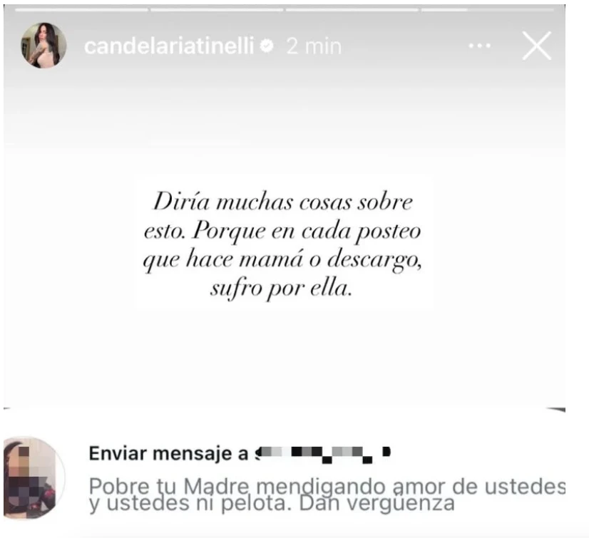 Lejos de obviar esa recriminación, Candelaria salió al universo de las redes sociales y contó toda su verdad. "Diría muchas cosas sobre esto, porque en cada posteo que hace mamá o descargo, sufro por ella", redactó. Así como corroboró que le envió un mensaje directo a esa internauta.