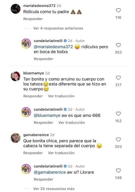 "Ridícula como el padre", asestó otra usuaria, lo que originó que Candelaria le pusiera: "Ridículos pero en boca de todos". Además, la joven recibió otra crítica sobre los diseños que impregnó en su piel: “Que bonita chica, pero parece que la cabeza separada del cuerpo”. A ese comentario, Tinelli retrucó: "Aw, ¿sí? lloraré".