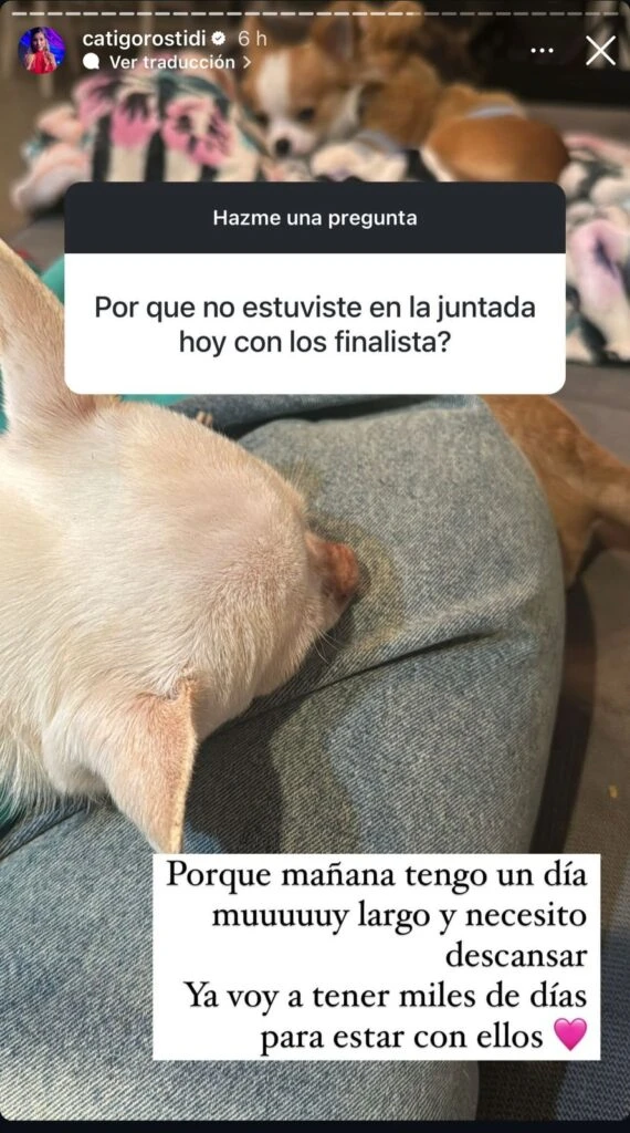 “Por qué no estuviste en la juntada hoy con los finalistas?”, preguntó una usuaria de instagram, a lo que ella contestó: “Porque mañana tengo un día muuuuuy largo y necesito descansar. Ya voy a tener miles de días para estar con ellos”.