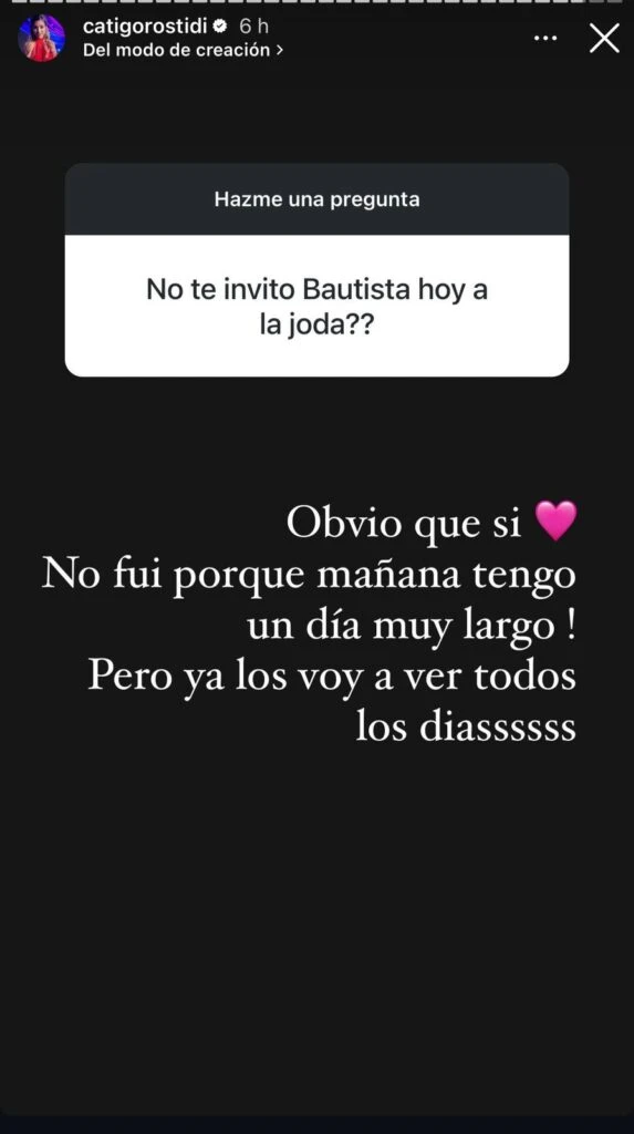Sin embargo, lejos de quedarse con ese argumento de la pareja de Joel Ojeda, otro internauta redobló: “¿No te invitó Bautista hoy a la joda?”. Volviendo a aclarar el tema de por qué no estuvo en la cena con sus ex compañeros de GH, Gorostidi explicó: “Obvio que sí. No fui porque mañana tengo un día muy largo. Pero ya los voy a ver todos los días”.