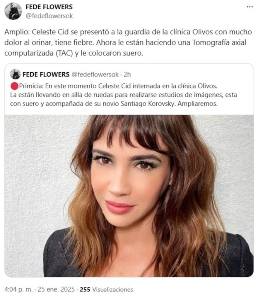 “En este momento, Celeste Cid internada en la Clínica Olivos. La están llevando en silla de ruedas para realizarse estudios de imágenes, está con suero y acompañada de su novio Santiago Korovsky”, comenzó escribiendo en X, para luego ampliar la información: “Se presentó a la guardia de la clínica Olivos con mucho dolor al orinar, tiene fiebre. Ahora le están haciendo una tomografía axial computarizada (TAC) y le colocaron suero”.