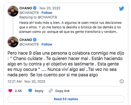 Hasta que Chano se sumergió en la problemática que lo atañe y que le activa una preocupación gigante. Así soltó: "Pero hace 9 días una persona que colabora conmigo me dijo: ‘Chano cuídate. Te quieren hacer mal. Están haciendo algo en tu contra y el objetivo es lastimarte. Esta gente es muy oscura’”.